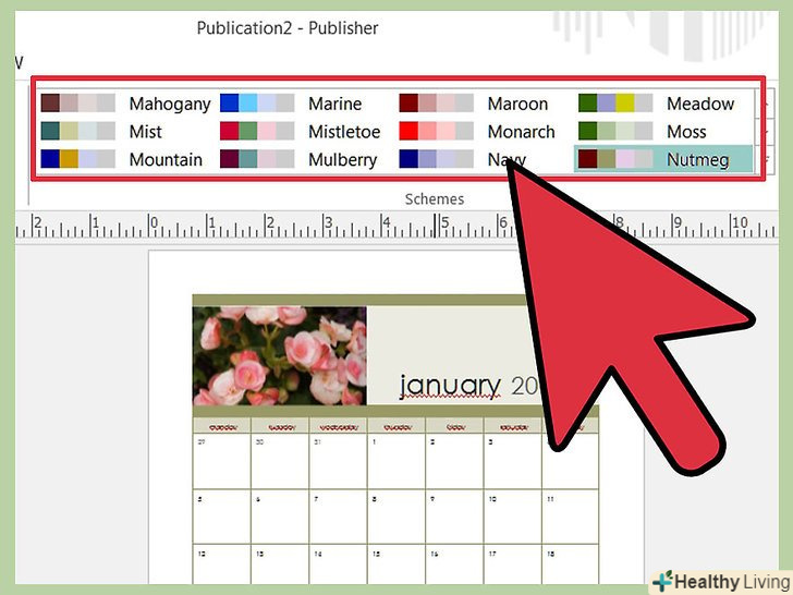 Виберіть шрифт і колірну схему. ці опції знаходяться на панелі Customize. (Ця панель знаходиться праворуч у головному вікні, а у вікні форматування публікації-з лівого боку робочої області екрану). Ви можете вибрати готову колірну схему і набір шрифтів або ж створити свої власний, вибравши опцію "Create New".- Якщо ви створюєте діловий календар, можна додати свої дані, вибравши опцію " Create New "у вкладці"Business information". Введіть свої дані в полях "Create New Business Information Set", дайте назву і клікніть"Save". Ви можете вибрати цю назву зі списку під час створення наступних календарів.