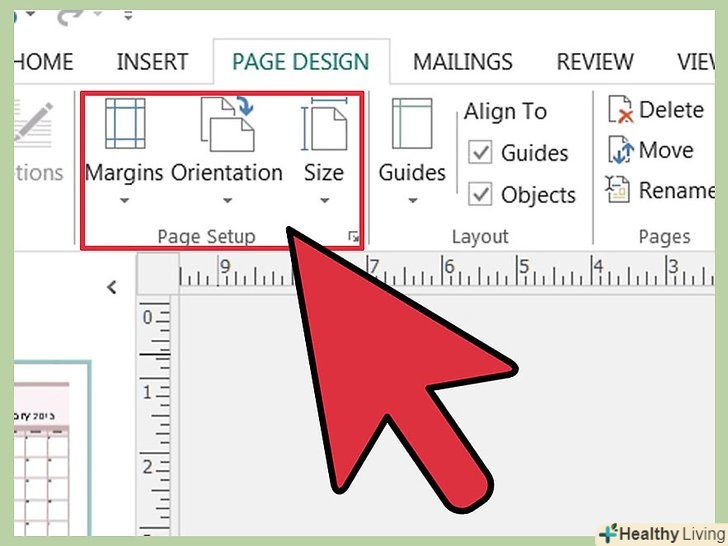 - Ви можете змінити розмір сторінки календаря, клікнувши на "Change Page Size" у вкладці publication Options панелі Format Publication. Вибравши blank Page Sizes, ви побачите розмітку сторінки вашого календаря. (Якщо розмітка показує, що календар виходить за межі сторінки, ви все одно можете вибрати цю опцію, а пізніше вручну відрегулювати елементи календаря).