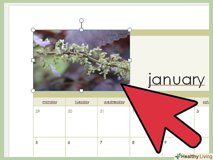 - Виберіть Empty Picture Frame, щоб окреслити рамку для картинки. Наведіть курсор на календар, утримуйте ліву кнопку миші і протягніть курсор, щоб створити рамку. Ви можете обертати рамку і змінювати її розміри за допомогою точок по її краях. Виберіть зображення, яке ви хочете вставити в рамку, використовуючи одну з опцій панелі інструментів Picture. (Цю опцію можна використовувати, щоб визначити місце розташування картинки ще до того, як ви її вставите).