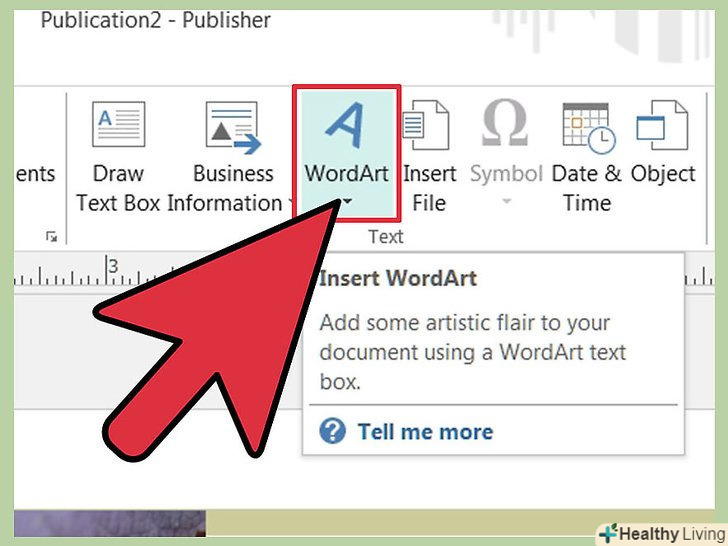 Натисніть Word Art або Text Box.обидві ці кнопки знаходяться на панелі інструментів Objects. Кнопка Word Art виглядає як дві великі літери A, нахилені вправо. Кнопка Text Box зображена у вигляді газетної сторінки з буквою а у верхньому лівому кутку.- Кнопка Word Art використовується для додавання невеликих декоративних написів. Вона дозволяє змінювати форму, шрифт, розмір, колір і накреслення букв.