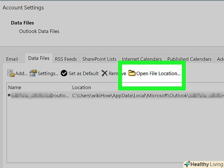 Запустіть Outlook, щоб знайти розташування файлів PST.знову відкрийте «налаштування облікових записів» (через сервіс або Файл → відомості) і клацніть на вкладку «Файли даних». Ви побачите список всіх адрес електронної пошти. Виберіть той, який видає помилку, а потім натисніть на «відкрити розташування файлу», щоб відкрити папку, в якій зберігається PST-файл.[6]\- Запам'ятайте розташування цього файлу-пізніше воно вам ще стане в нагоді.