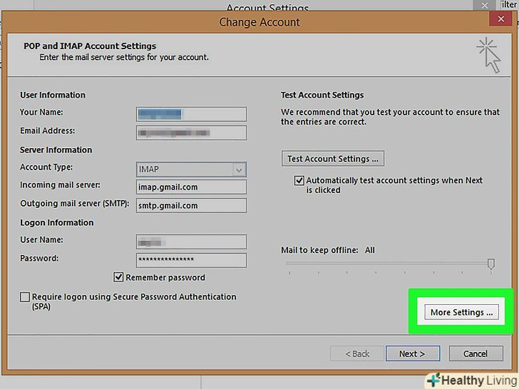 Натисніть "ОК", щоб зберегти налаштування і повернутися до поштового аккаунту.не натискайте на кнопку "Перевірка облікового запису". Вона нічого не дасть і може відкотити внесені зміни. Натисніть "Готово«, щоб закрити вікно налаштувань, а потім» Закрити", щоб вийти з налаштувань облікових записів.- Примітка: точне формулювання може дещо відрізнятися залежно від версії Outlook. Важливо лише те, щоб ви не натиснули «скасування». Щоб закрити Налаштування, натисніть «ОК», «Готово» або «застосувати».