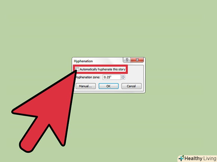 - Виберіть " Hyphenation "і зніміть прапорець біля поля" Automatically hyphenate this story " (автоматично розставляти переноси в цій історії).