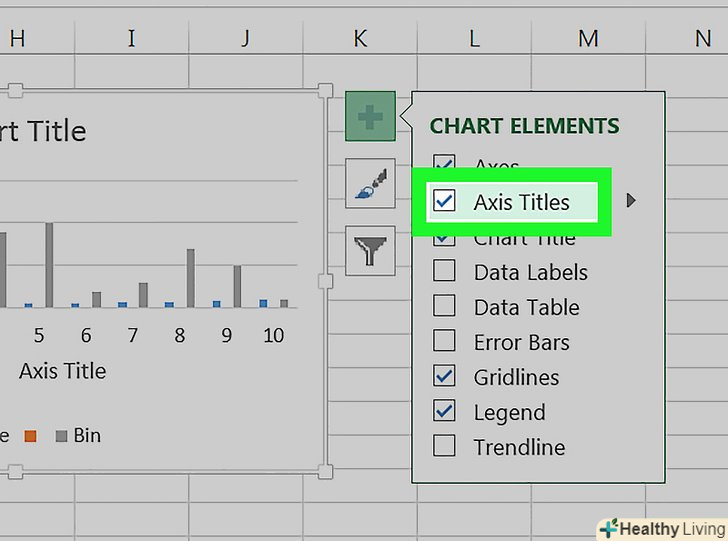Поставте прапорець у опціїНазва осей. вона знаходиться у верхній частині меню, що випадає. Поруч з вертикальною віссю і під горизонтальною віссю відкриються текстові поля.- Якщо біля опції "підписи осей" вже є прапорець, приберіть його, а потім знову поставте, щоб відобразити текстові поля біля осей.