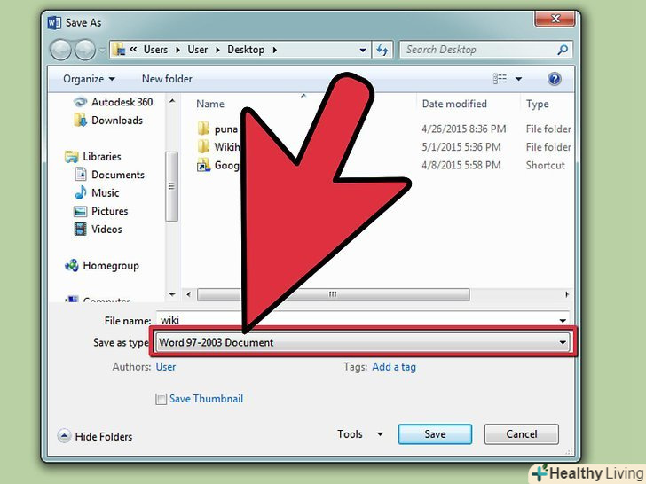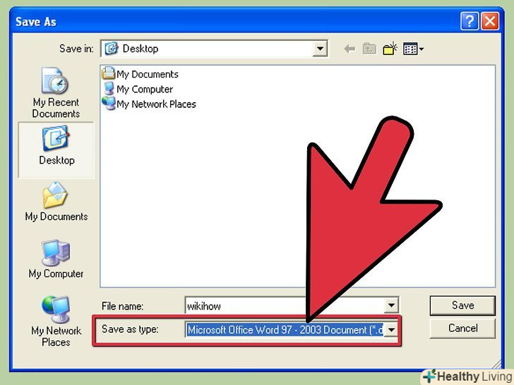Збережіть відкритий документ у форматі DOC. відкривши DOCX файл, ви можете зберегти його у форматі DOC (якщо потрібно), щоб відкривати його на інших комп'ютерах, на яких немає вищевказаного пакету оновлень.[1]- Натисніть» Файл «і виберіть "Зберегти як". У меню «Тип файлу» виберіть "DOC".