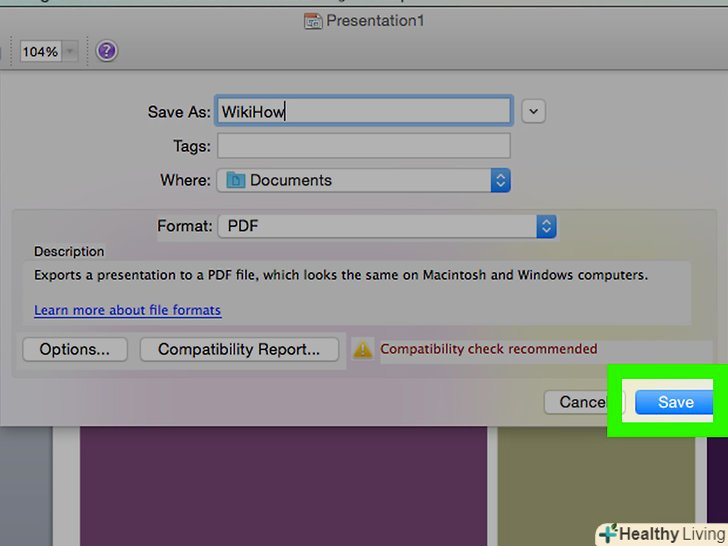 НатиснітьЗберегти (Windows) або Експортувати (Mac OS X).презентація PowerPoint буде збережена як PDF-документ у зазначеній папці.