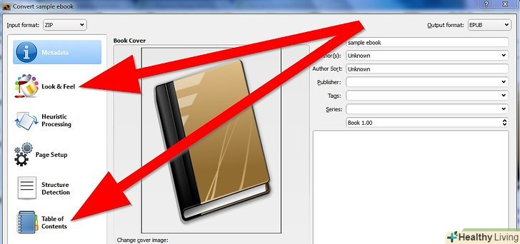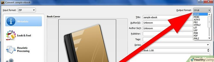 Натисніть " OK "для виходу назад на головний екран і натисніть кнопку"Convert books". вікно "Convert books" має з'явитися. У верхньому правому куті екрана знайдіть меню "Output format", виберіть MOBI або EPUB. Ви не можете зробити те й інше відразу, але можете вибрати 1 варіант, потім поверніться і виконайте інший.- Меню з лівого боку має кілька пунктів, але вам знадобиться тільки "Look and Feel" і "Table of Contents."
