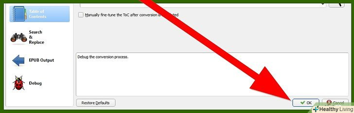 Виберіть " h1 " з цього списку.потім натисніть " OK."Тепер ви побачите" / / H:h1", вказаний у полі Level 1 TOC.- Натисніть "OK"і Calibre відразу почне перетворення. перетворення повинно зайняти кілька секунд. Якщо ви перетворюєте в MOBI в перший раз, то знову натисніть кнопку "Convert books" і виберіть EPUB, щоб конвертувати в цей формат. Потім ви натисніть велику кнопку"Save to disk".