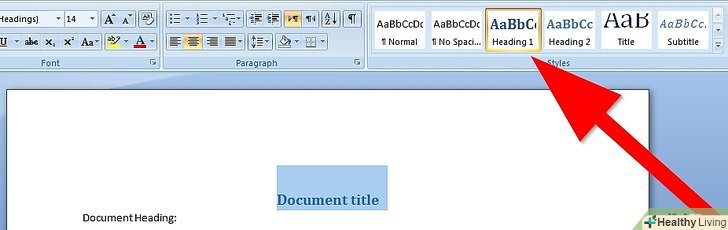 Виділіть основну назву, виберіть "Format gt; Styles and Formatting" або еквівалентний варіант для зміни "стилю"користувача, потім виберіть зі списку варіантів стилю: "Heading 1" Як показано тут: