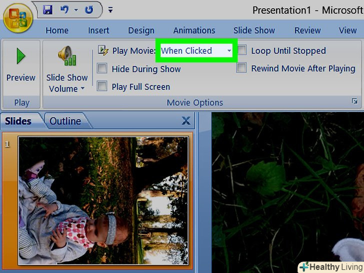 Відкрийте меню "Пуск", щоб задати метод запуску відтворення відео. за замовчуванням для відтворення відеоролика необхідно клацнути по ньому. Якщо вибрати опцію «Автоматично», відтворення відео почнеться в момент переходу на слайд з відеороликом.- Поставте прапорці біля відповідних опцій, якщо вам потрібно, щоб Відеоролик відтворювався циклічно або перемотувався на початок.
