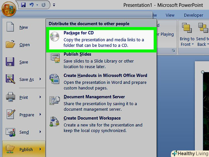 При відправці презентації скористайтеся функцією "підготувати для компакт-диска". одержувач презентації не зможе відтворити відео, якщо разом з нею ви не відправите відеофайл (не забувайте, що даний метод має на увазі відтворення відеоролика з конкретної папки). Скориставшись функцією "підготувати для компакт-диска", Ви відправите презентацію і будь-які супутні файли у вигляді одного файлу.- Натисніть кнопку "Office «і виберіть»опублікувати".