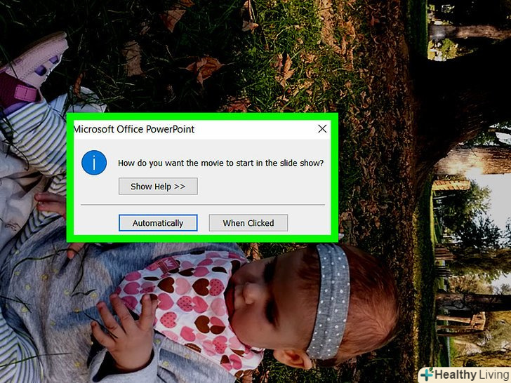 Задайте метод запуску відтворення відеоролика.після того як ви виберете відеофайл, PowerPoint запропонує вам визначити метод запуску відтворення. Опція "автоматично" запустить відтворення відео при переході на слайд з роликом. Опція "за клацанням" запускає відтворення відеоролика тільки після того, як ви клацнете по ньому.[6]