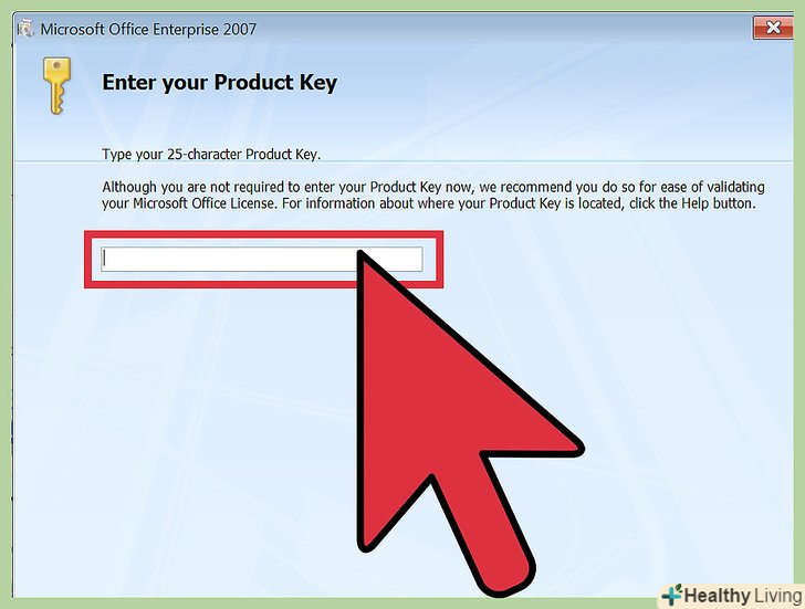 Введіть 25-значний ключ продукту, а потім натисніть «Продовжити». Ключ продукту для Office 2007 можна знайти всередині коробки з-під компакт-диска або в електронному листі з підтвердженням про покупку Office. [1]