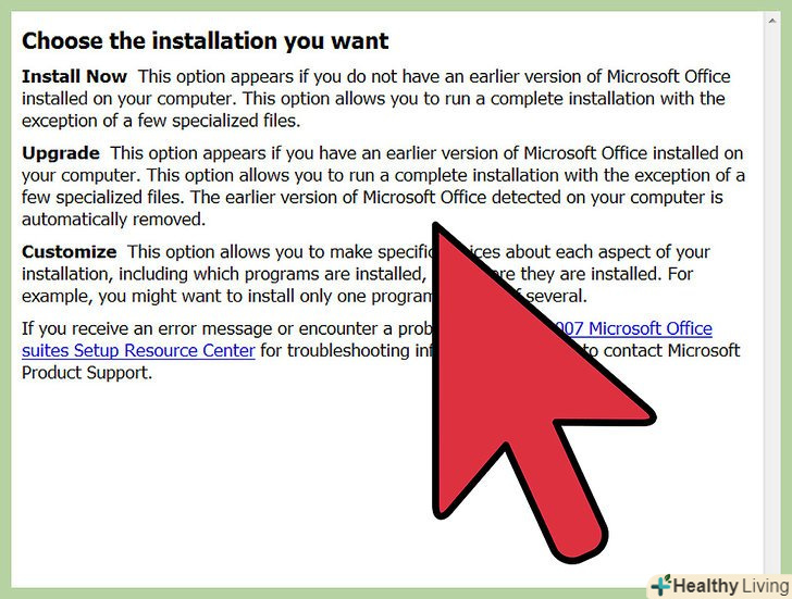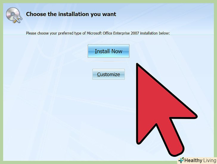 Залежно від типу установки, натисніть на «оновити» або «налаштування». Натисніть на «Оновити», якщо ви хочете, щоб Office 2007 замінив старішу версію Office. Якщо ви хочете залишити на комп'ютері поточну версію Office, виберіть "Налаштування".- Якщо ви вибрали опцію «Налаштування», натисніть на Перемикач «зберегти всі попередні версії», а потім натисніть на вкладку «Параметри установки» і натисніть на кнопку «Встановити». Майстер приступить до установки пакету програм.