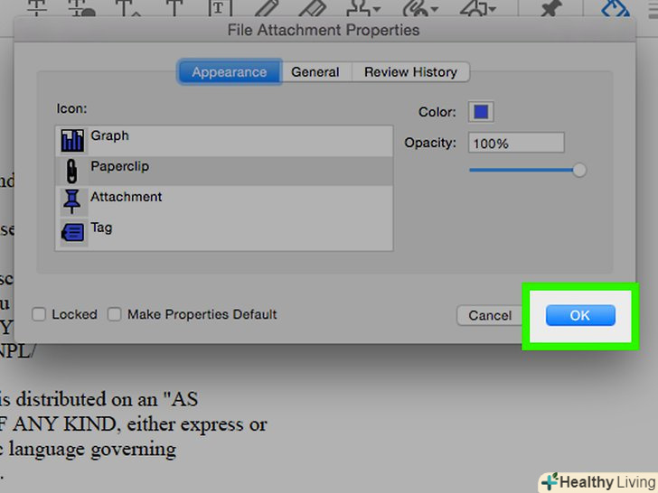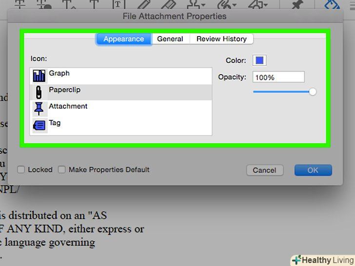 Налаштуйте зовнішній вигляд вкладення. у діалоговому вікні виберіть значок, що позначає прикріплений файл, а також колір і непрозорість значка.