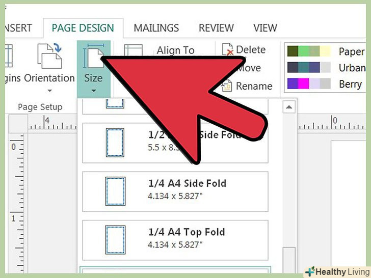 Вирішіть, як ваша листівка буде складатися.Ваше запрошення буде друкуватися на одному аркуші паперу, але його можна скласти 1-м з 3 способів. Ви вибираєте, Яким способом ваша картка складається з випадаючого вікна "Page Size" в розділі Options на панелі завдань Task pane. Доступні такі опції:- Quarter-page side fold-сторінки вашої картки будуть друкуватися на одній стороні сторінки, а в складеному вигляді: буде створена картка, яка відкривається з лівого боку.