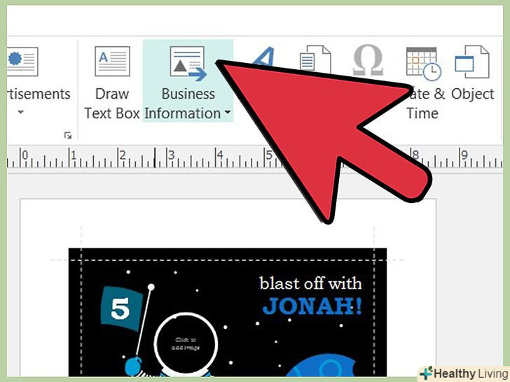 Вставте інформацію про свою компанію або особисту інформацію, якщо це необхідно. якщо ви використовуєте Publisher 2003, програма запросить у вас цю інформацію, якщо використовуєте її вперше. Після цього вибираєте дану інформацію з " Personal Information "(особиста інформація) в меню "Edit" (Правка), щоб вставити її в запрошення. У Publisher 2007 і 2010: Ви можете вибрати інформацію про свою компанію в випадаючому вікні " Business Information "(Бізнес-інформація), або виберіть "Create New" (створити новий), щоб створити новий набір інформації. Ця інформація буде вставлена в запрошення.