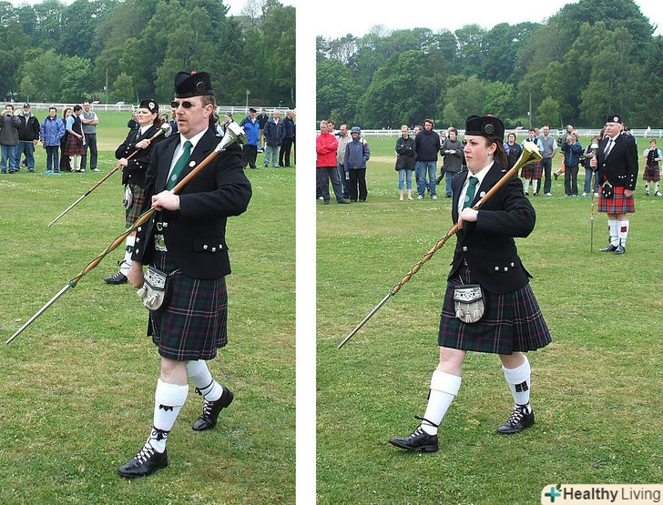 Навчіться поводитися з жезлом, якщо він у вас є.знову ж таки, головне-практика, а стиль може змінюватися. Тут головне-розрахувати час. Також стежте, щоб кут напрямку жезла не змінювався протягом руху.- практикуйтеся з жезлом у формі, особливо це стосується кілтів, головних уборів, і всього, що може перешкодити руху. Нікого не потішить, якщо ви зіб'єте з себе капелюх.Full regalia.