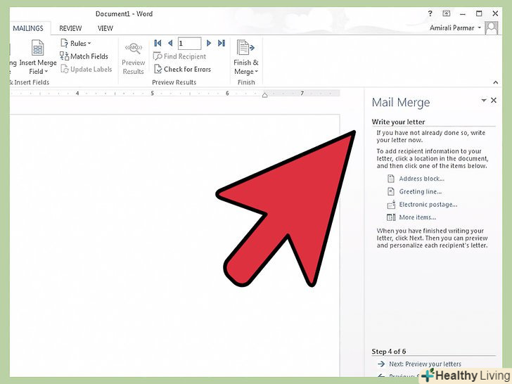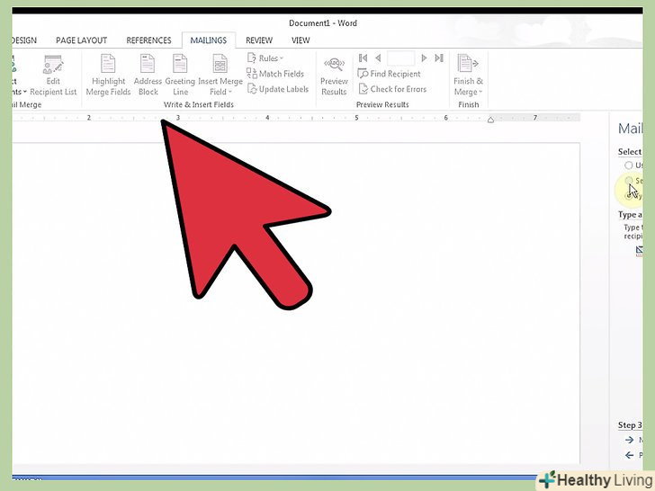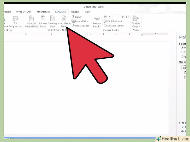 Вставте поля з інформацією.на наступній сторінці панелі завдань вам запропонують створити документ, якщо ви не зробили цього заздалегідь, і кілька опцій по додаванню інформації про одержувачів в документ.- Додавання інформації здійснюється розміщенням курсору на місце, куди необхідно додати інформацію, і натисканням відповідної кнопки на панелі завдань.