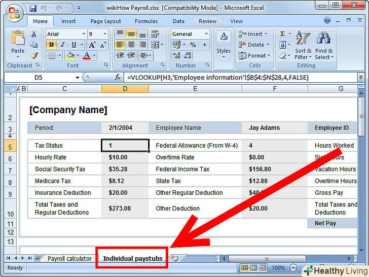 Отримайте доступ до заробітної плати або платіжних квитанцій ваших співробітників.- Натисніть на вкладку "Individual Pay Stubs"("індивідуальні розрахункові квитанції"), яка розташована внизу відразу за вкладкою "Payroll Calculator"("Калькулятор заробітної плати"). Цей лист містить формули і функції, які витягують введені вами дані і відображають їх у вигляді платіжних відомостей для кожного співробітника.