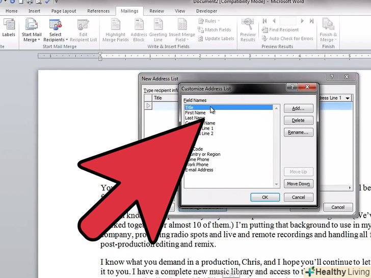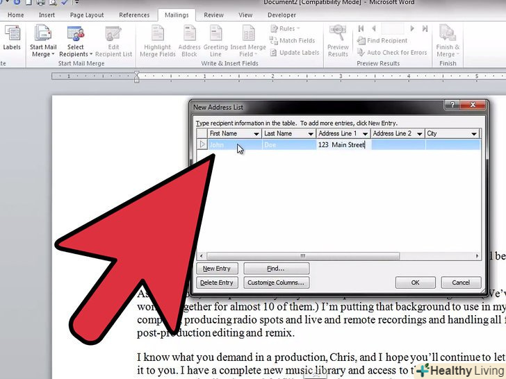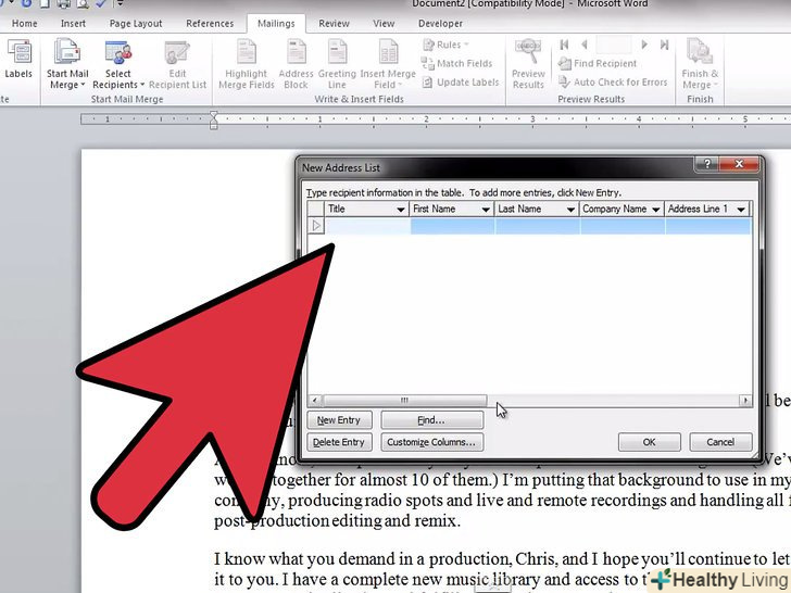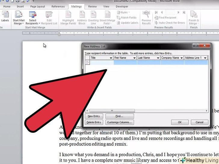 Натисніть "ВИБРАТИ одержувачів" і виберіть метод додавання одержувачів.одержувачі – це найголовніша частина функції злиття, так як дозволяє заповнювати «поля» інформацією про кожного одержувача. Ви можете ввести одержувачів вручну, завантажити таблицю або базу даних або завантажити контакти з Outlook.- Вибравши "Ввести новий список", відкриється нове вікно, в якому ви зможете ввести інформацію про кожного одержувача. Це стане в нагоді, якщо у вас немає доступу до таблиці з інформацією про одержувачів, але це дуже повільний спосіб введення даних. Ви можете натиснути кнопку "Налаштування стовпців" для створення стовпців з відповідною інформацією.