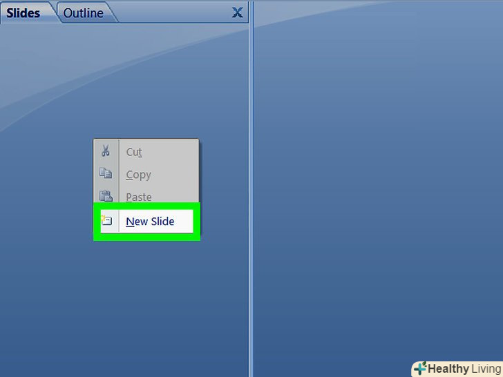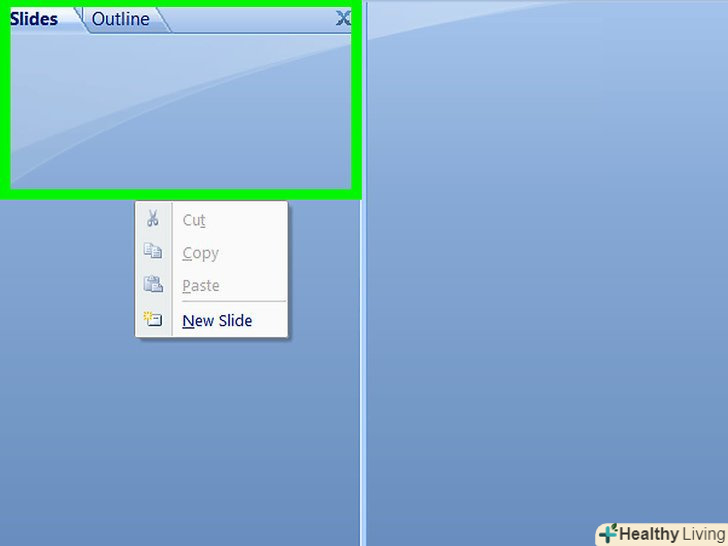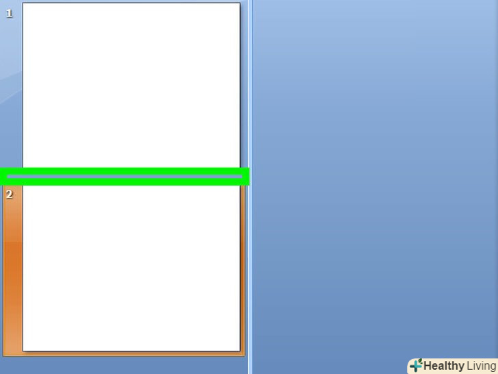 Клацніть по порожньому простору між двома слайдами на бічній панелі. бічна панель розташована в лівій частині вікна PowerPoint і містить мініатюри всіх слайдів презентації; якщо клацнути по порожньому простору між двома слайдами, ви вкажете місце, куди буде додано новий слайд.