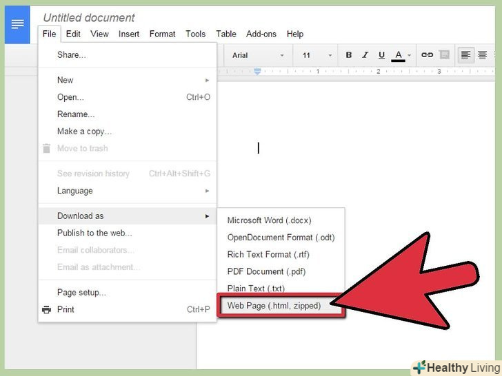 - У меню Google Документи натиснітьФайл → Завантажити як → Веб-сторінка.