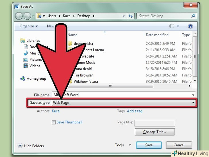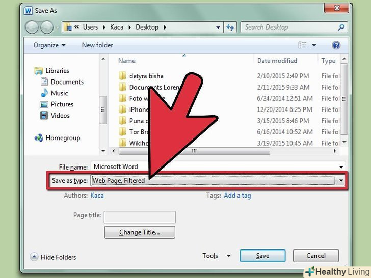 У деяких версіях Word ви можете зберегти документ у HTML-файлі, дуже схожому на вихідний документ, але який буде завантажуватися швидше (як веб-сторінка).якщо ви не плануєте конвертувати HTML-файл назад у документ Word, виберіть "веб-сторінка з фільтром".[6]- Якщо ця опція недоступна, збережіть документ у вигляді "звичайної" веб-сторінки, а потім скористайтеся онлайн інструментомAlgotech's Mess Cleaner для перетворення "звичайної" веб-сторінки в невеликий HTML-файл.