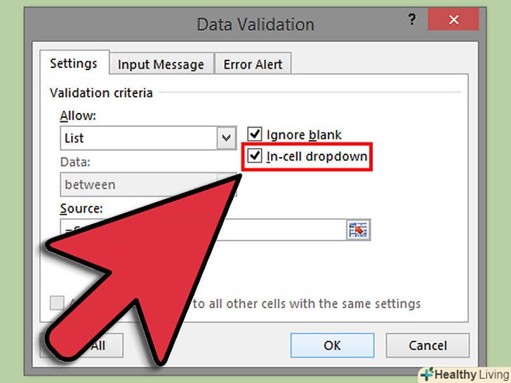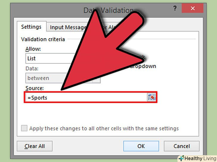У рядку «джерело» введіть знак рівності і назву вашого випадаючого списку.наприклад, якщо ваш випадаючий список називається "види спорту", введіть "=види спорту".