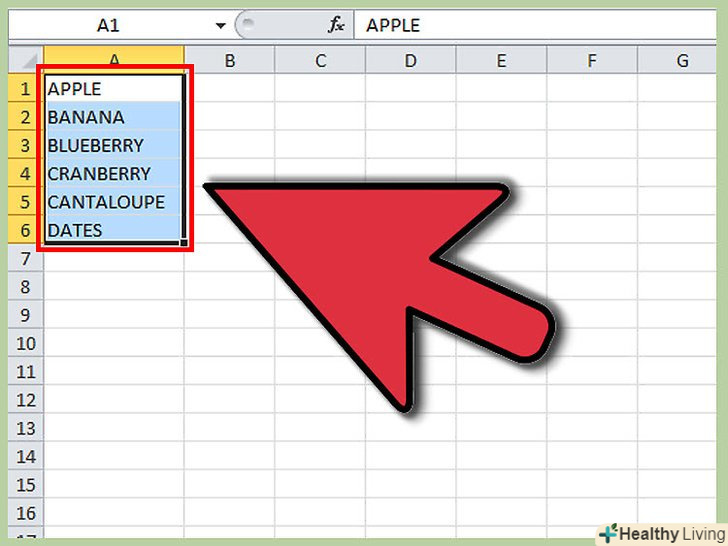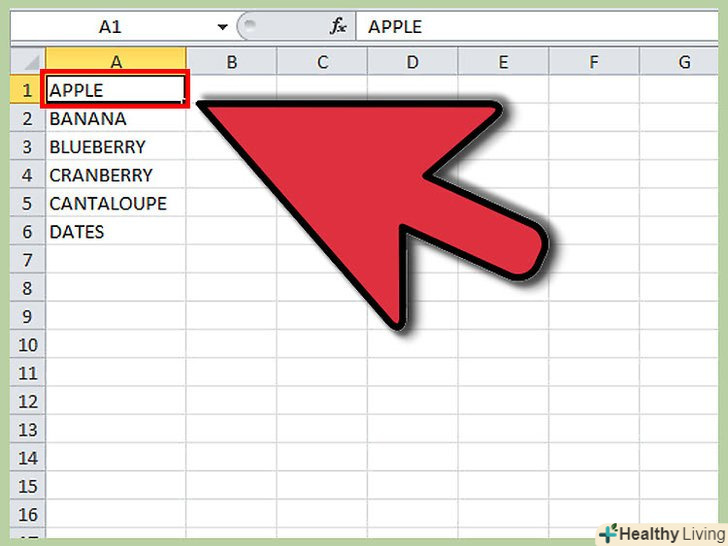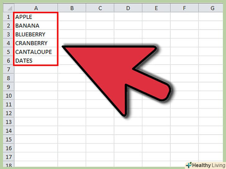 Введіть список елементів, які будуть відображатися в випадаючому списку. кожен елемент вводиться в окрему комірку в кожному новому рядку. Наприклад, якщо ви створюєте випадаючий список з назвами фруктів, введіть "яблуко" в комірці A1, "банан" в комірці A2, "чорниця" в комірці A3 і так далі.