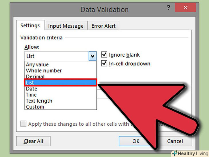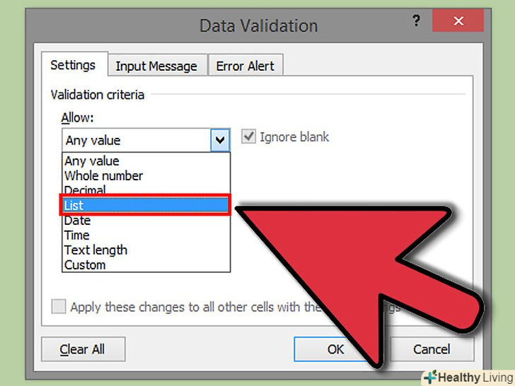 Перейдіть на вкладку "Параметри".виберіть "Список" зі спадного меню "Тип даних".