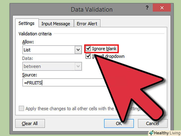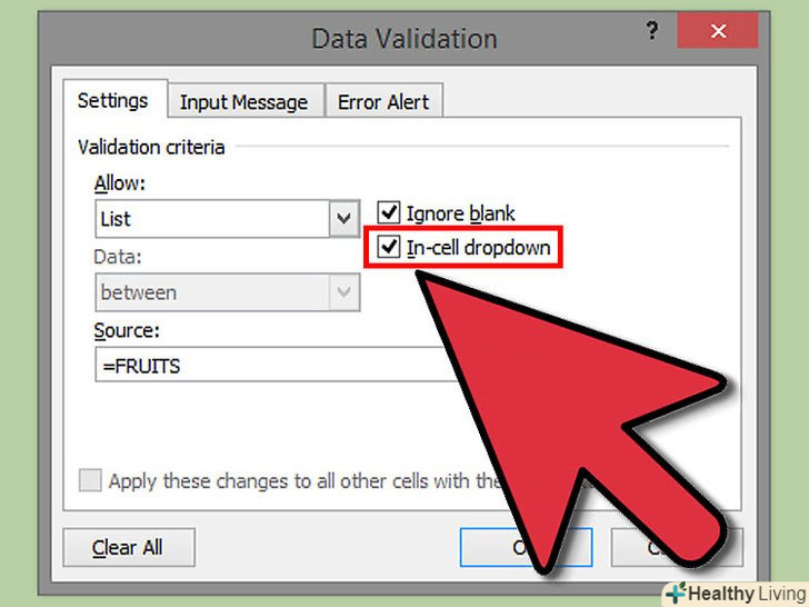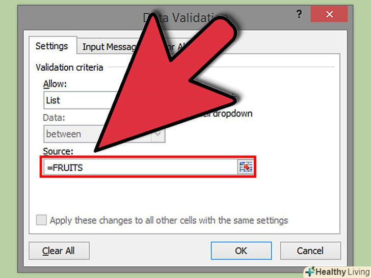 У рядку «джерело» введіть знак рівності і назву вашого випадаючого списку.наприклад, якщо ваш випадаючий список називається "фрукти", введіть "=фрукти".