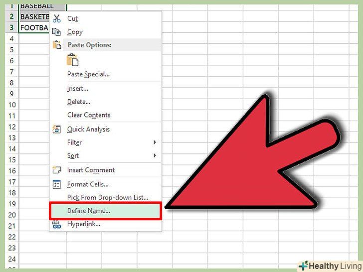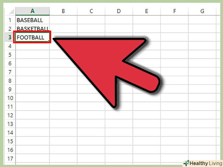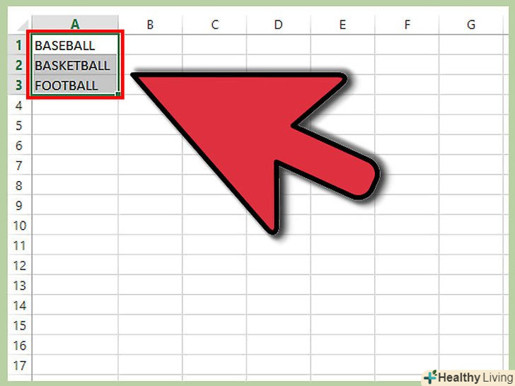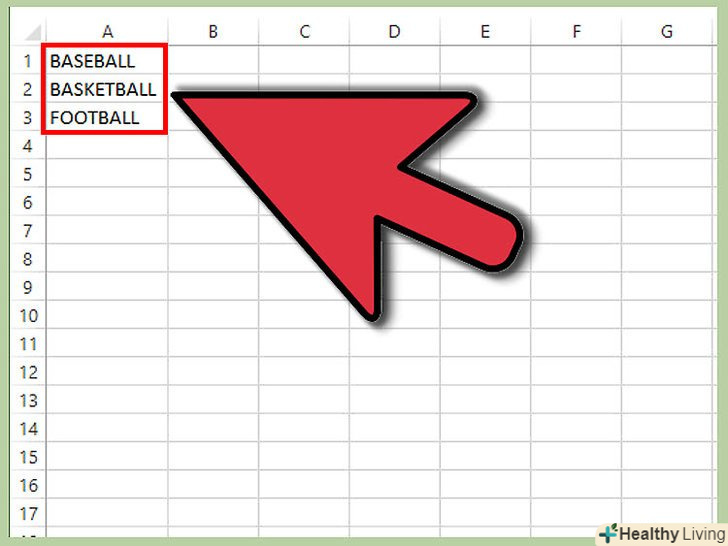 Введіть список елементів, які будуть відображатися в випадаючому списку. кожен елемент вводиться в окрему комірку в кожному новому рядку. Наприклад, якщо ви створюєте випадаючий список з назвами видів спорту, введіть "бейсбол" в комірці A1, "баскетбол" в комірці A2, "футбол" в комірці A3 і так далі.
