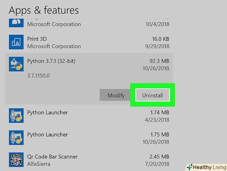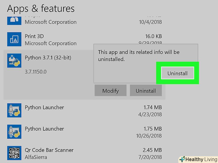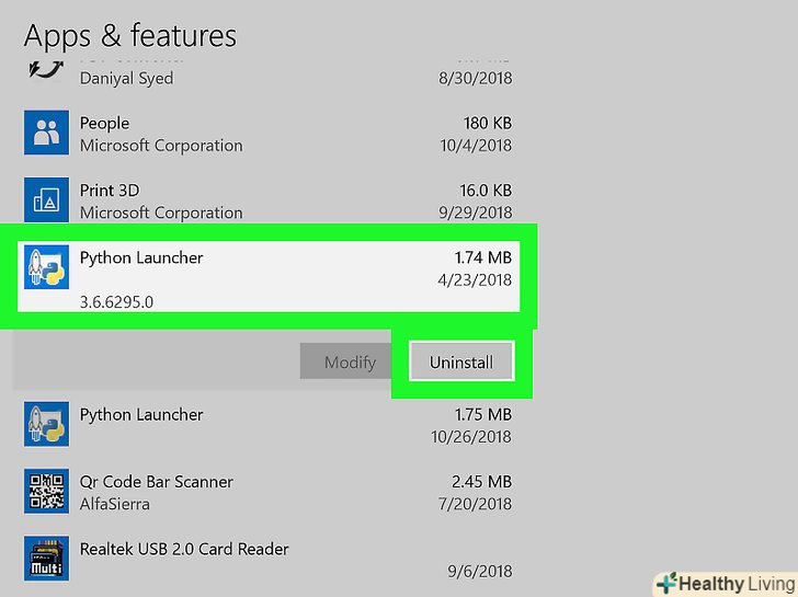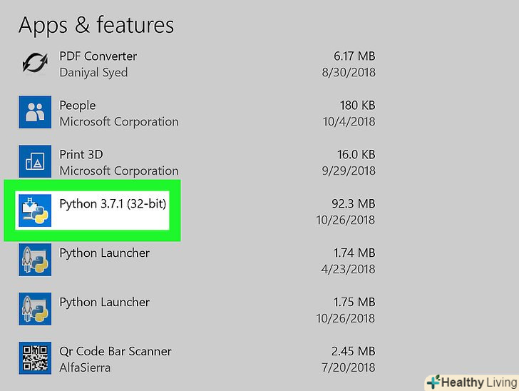 Видаліть інші версії Python (якщо необхідно).оскільки на комп'ютері може бути встановлено відразу кілька версій Python, пошукайте їх в списку встановлених додатків; Якщо Ви знайшли іншу версію Python, повторіть описані вище кроки, щоб видалити її.- Також можна видалити програму Python Launcher.