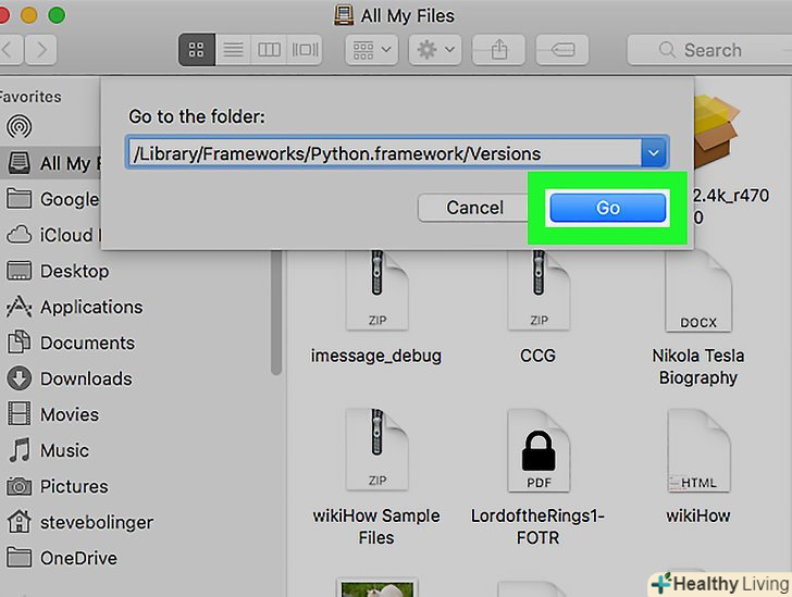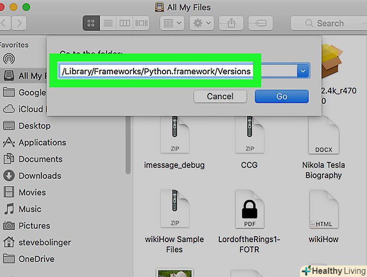 Введіть шлях до папки з Python. залежно від встановленої версії Python в текстовому полі «Перейти в папку» введіть один з наступних шляхів: [1]- Python 3.6 і вище:/Library/Frameworks/Python.framework/Versions