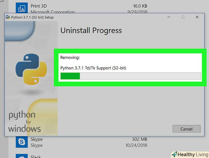 Зачекайте, поки Python буде видалено.відкриється спливаюче вікно з індикатором прогресу; як тільки індикатор заповниться, вважайте, що Python видалений.- Можливо, під час видалення вам доведеться клацнути по потрібних опціях у вікнах, що відкрилися.