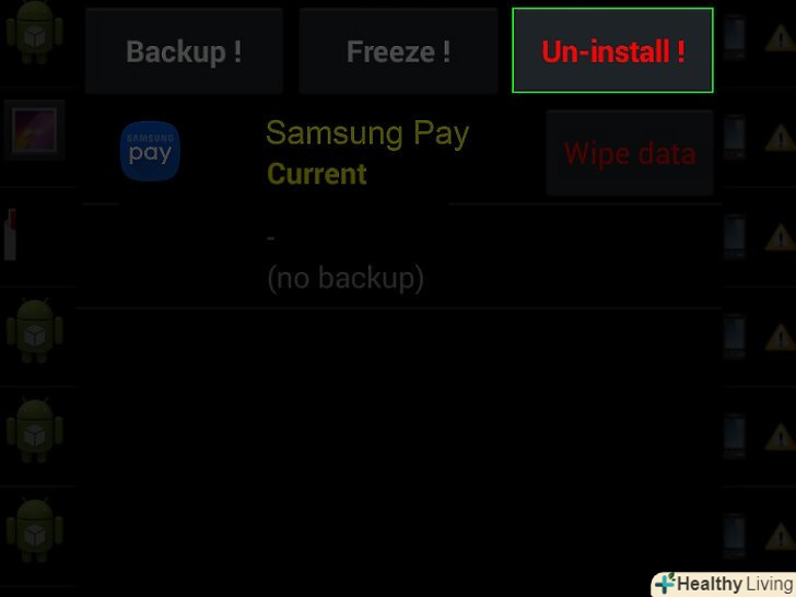 НатиснітьUn-install! (видалити).ця опція знаходиться у верхній частині екрана. Titanium Backup приступить до видалення програми Samsung Pay.- Також можна вибрати опцію " Freeze "(зупинити), щоб Samsung Pay залишилося в пам'яті пристрою, але було видалено з інтерфейсу і не працювало у фоновому режимі. Виберіть цю опцію, якщо не хочете повністю видаляти додаток.[1]