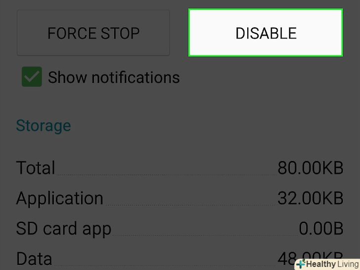 НатиснітьВідключити. ви знайдете цю кнопку вгорі сторінки з інформацією про програму (як правило, замість цієї кнопки відображається кнопка «Видалити»).- ТоркнітьсяВідключити , коли з'явиться запит.програма Samsung Pay буде відключена.