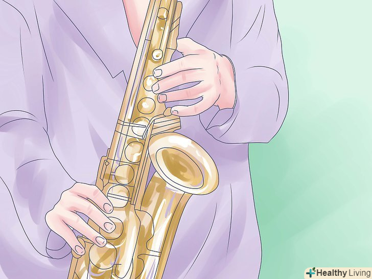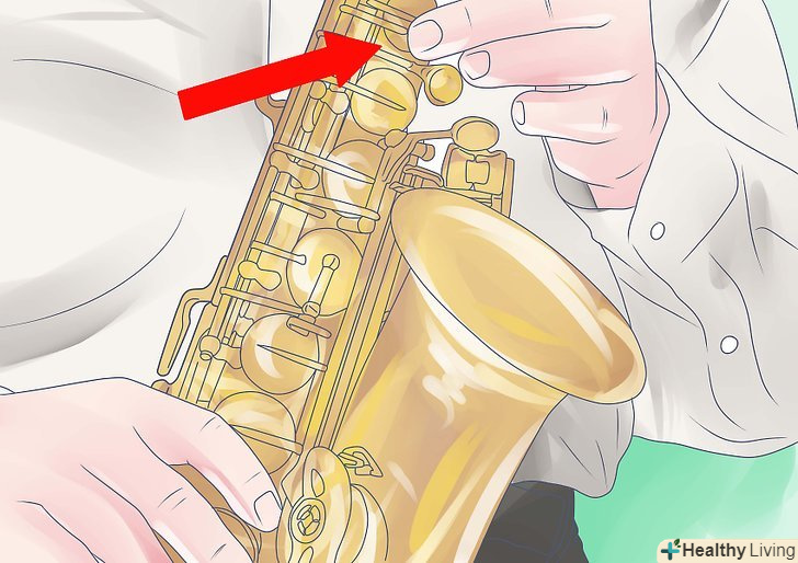 Зберіть саксофон.вставте еску - подмундштучную трубку (коротка, пряма і трохи нахилена вгору частина) - у верхню частину корпусу інструменту і закріпіть еску гвинтом. Пам'ятайте, що ваш октавний клапан (довгий важіль у верхній частині ески) дуже чутливий. Будьте обережні при складанні. Помістіть лігатуру на мундштук і посуньте тростину під лігатуру, закріпивши її гвинтами. Прикріпіть шийний ремінець до гака на задній панелі інструменту, надіньте його на шию і встаньте.