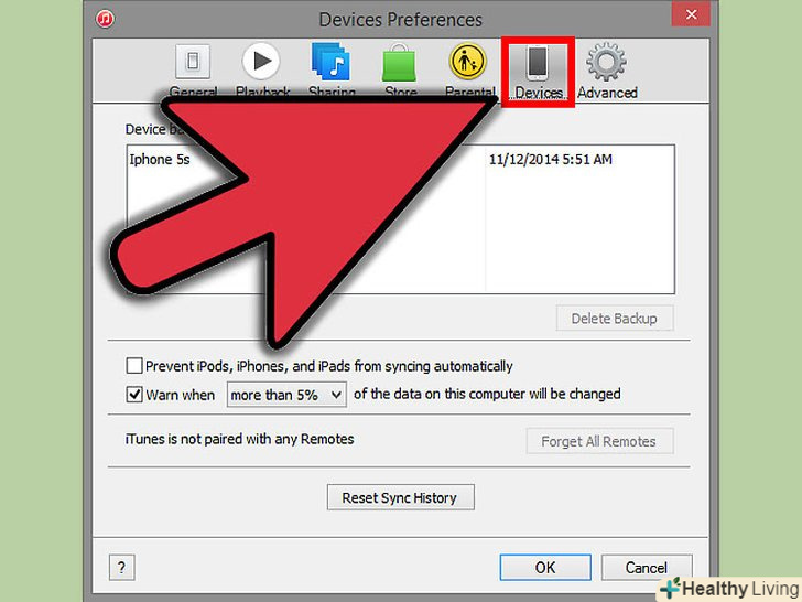 Перейдіть на вкладку "пристрій" з настройками резервного копіювання і автоматичної синхронізації.- "заборонити автоматичну синхронізацію" - за замовчуванням, пристрої від Apple будуть синхронізовані автоматично (при їх підключенні). Якщо вам це не потрібно, потавьте прапорець у цій опції.