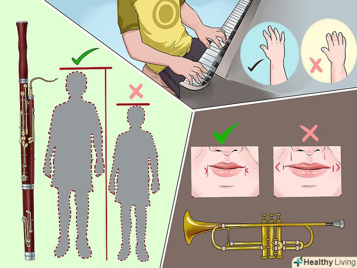 Оцініть тип статури своєї дитини.тип статури деяких дітей робить їх більш схильними до певних інструментів. Враховуйте це при виборі музичного інструменту.[3]- Коли справа стосується вибору музичного інструменту, важливим фактором виступає зростання. Дитині маленького зросту не дуже підійде занадто великий інструмент, наприклад, фагот.