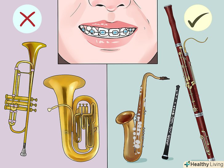 Виберіть інструмент, який підійде для дитини з брекетами.якщо ваша дитина носить брекети або їх скоро встановлять, це може сильно вплинути на гру на тому чи іншому інструменті.[4]- Брекети не сильно завадять здатності дитини грати на кларнеті і саксофоні. У випадку з флейтою потрібно буде трохи пристосуватися, але потім дитина з брекетами зможе успішно на ній грати. Фагот і гобой теж підійдуть.[5]