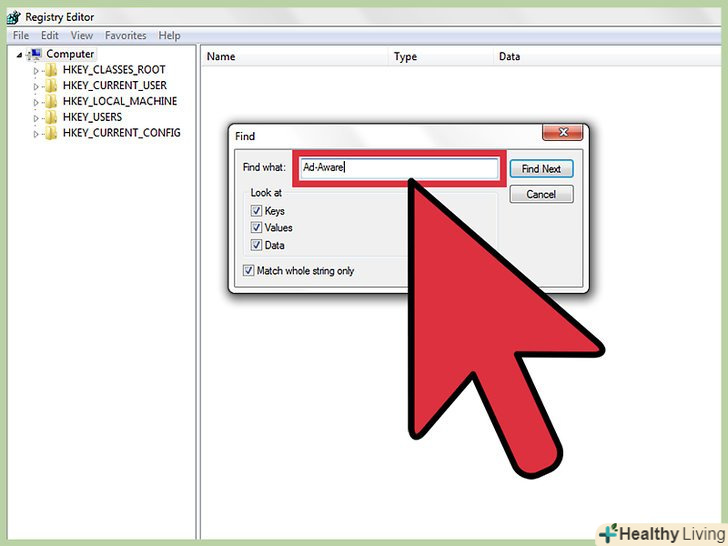 В реєстрі знайдіть і видаліть записи, залишені програмою Ad-Aware. натисніть ⊞ win+↵ Enter. Відкриється редактор реєстру. У рядку меню редактора реєстру натисніть «Правка» – «Знайти».[12] у рядку пошуку вікна введіть ad-aware і видаліть знайдені записи реєстру.