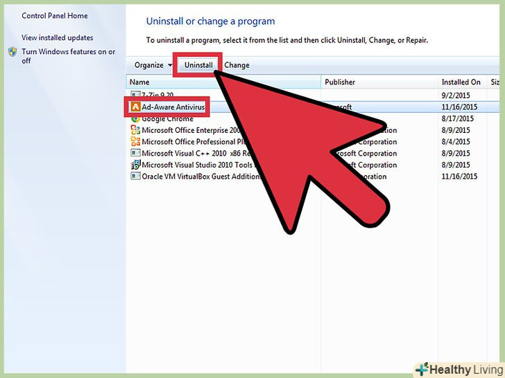 Відкрийте список програм, встановлених на вашому комп'ютері (в Windows 7/Vista). натисніть «Пуск» – «Панель управління» (кнопка "Пуск" знаходиться в нижньому лівому кутку екрану). Для того щоб швидко відкрити меню «Пуск», натисніть клавішу ⊞ win. У вікні панелі керування в розділі «програми» натисніть "видалення програми".[5]