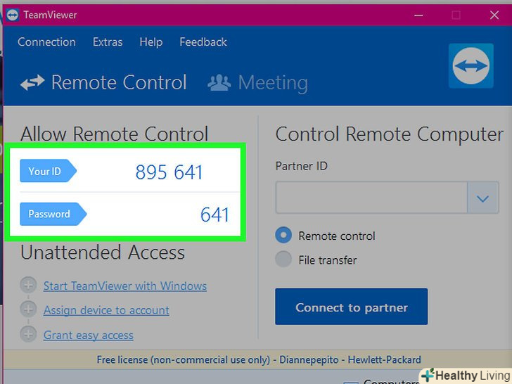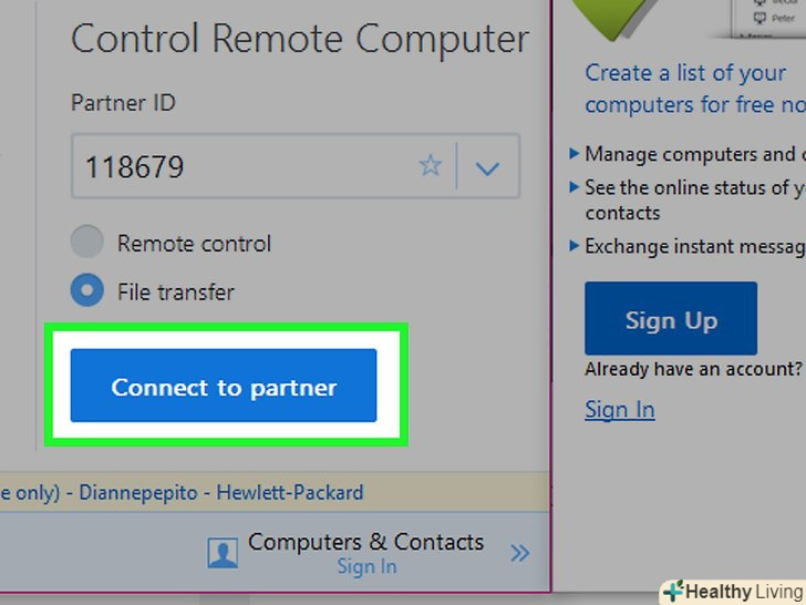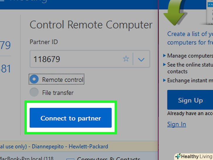 Введіть ID віддаленого комп'ютера в полеID партнера.так ви повідомите програмі, що їй потрібно підключитися до віддаленого комп'ютера, який ви налаштували.