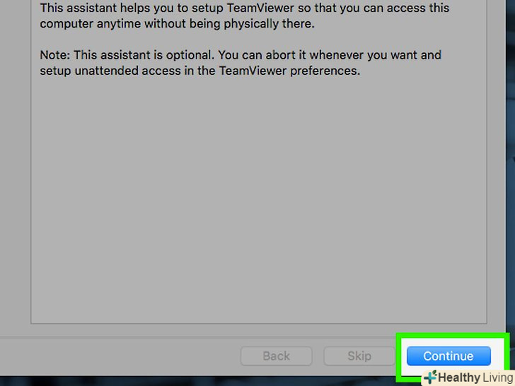 Натисніть < span class="nowrap" title="This is not a clickable button; it illustrates the button one should find." style="font-family: Segoe UI, Frutiger, Frutiger Linotype, Dejavu Sans, Helvetica Neue, Arial, sans-serif;letter-spacing:0px;padding:0em .6em; border:1px solid; border-color:#AAA #555 #555 #AAA; -moz-border-radius: 0px; -webkit-border-radius: 0px; border-radius: 0px; background-color: #F2F2F2; background-image: -moz-linear-gradient(top, #FCFCFC, #E0E0E0); background-image: -o-linear-gradient(top, #FCFCFC, #E0E0E0); background-image: - webkit-linear-gradient(top, # FCFCFC, #E0E0E0); background-image: linear-gradient(top, #FCFCFC, #E0E0E0);">продовжити.якщо ви встановлюєте TeamViewer для підключення до іншого комп'ютера, натисніть на "пропустити".