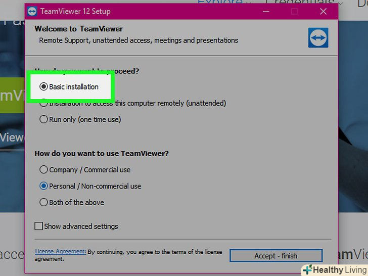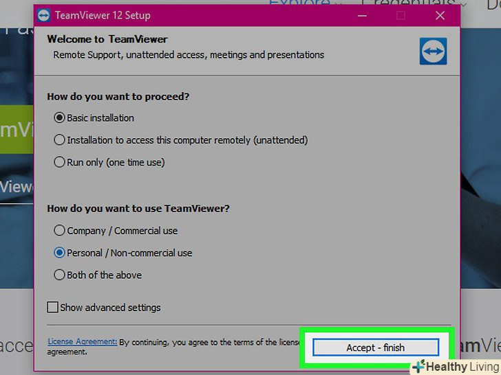 Натисніть на < span class="nowrap" title="This is not a clickable button; it illustrates the button one should find." style="font-family: Segoe UI, Frutiger, Frutiger Linotype, Dejavu Sans, Helvetica Neue, Arial, sans-serif;letter-spacing:0px;padding:0em .6em; border:1px solid; border-color:#AAA #555 #555 #AAA; -moz-border-radius: 0px; -webkit-border-radius: 0px; border-radius: 0px; background-color: #F2F2F2; background-image: -moz-linear-gradient(top, #FCFCFC, #E0E0E0); background-image: -o-linear-gradient(top, #FCFCFC, #E0E0E0); background-image: - webkit-linear-gradient(top, # FCFCFC, #E0E0E0); background-image: linear-gradient(top, #FCFCFC, #E0E0E0);">встановити.почнеться установка програми, яка дозволить отримувати віддалений доступ до комп'ютера або виконувати віддалене підключення.- Windows дозволяє запускати TeamViewer без попередньої установки, що дуже корисно, якщо у вас немає прав адміністратора до поточного комп'ютера. В такому випадку виберіть опцію "тільки запустити".