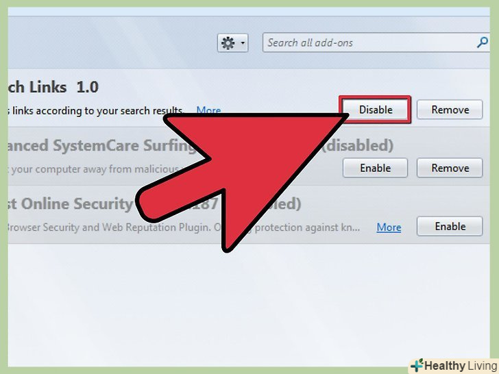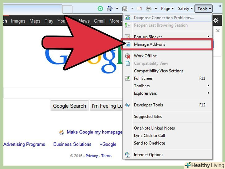 Відкрийте Internet Explorer. натисніть на кнопку Налаштування у верхньому кутку. Виберіть опцію Доповнення.