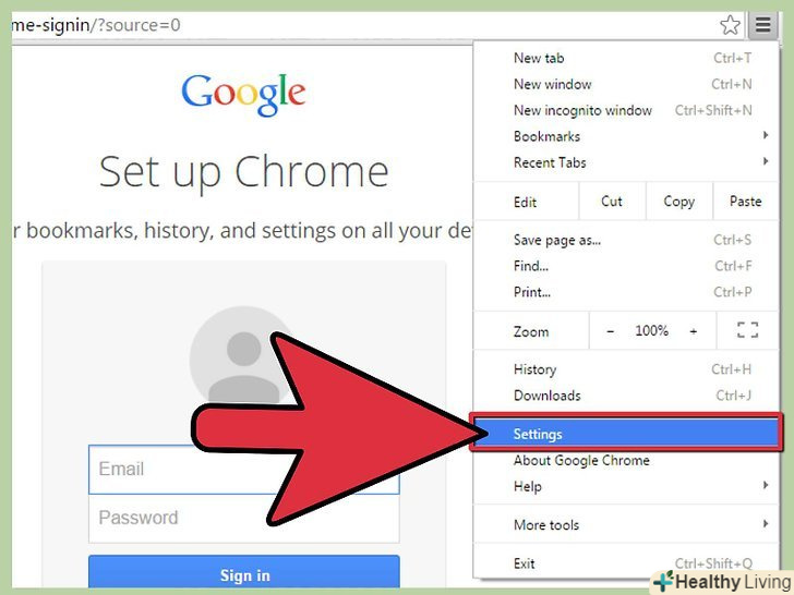 Відкрийте Chrome.відкрийте меню у верхньому правому куті. Це квадратна кнопка з горизонтальними смужками. Виберіть Налаштування з меню. У новій вкладці відкриються Налаштування.