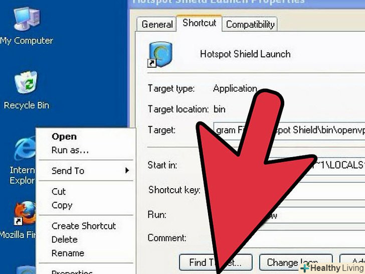 Ви можете натиснути на ярлик програми Hotspot Shield і зайти в властивості. натисніть на вкладку знайти Об'єкт
